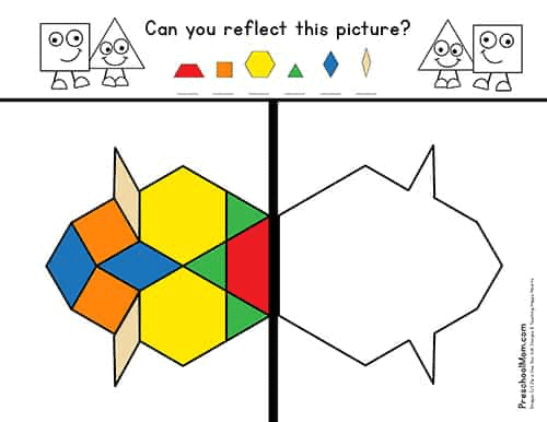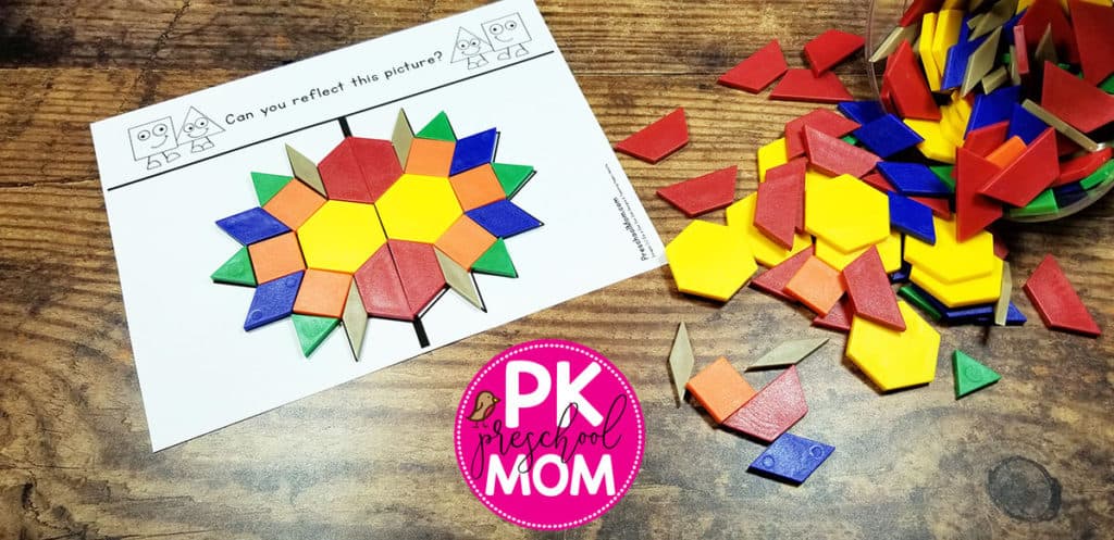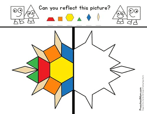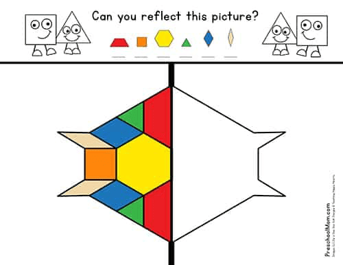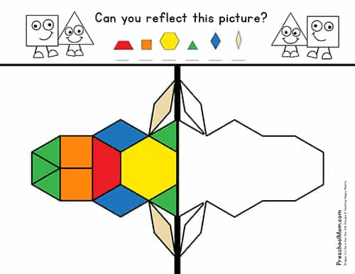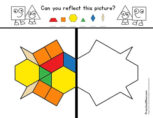 Students who have mastered basic pattern block patterns can try their hand at reflecting an image across a line of symmetry. These activity mats are a bit more difficult, and not all of your preschool students will be able to grasp this concept. However, because many students will be able to understand this important skill, it is still a great activity to include with your math learning centers.